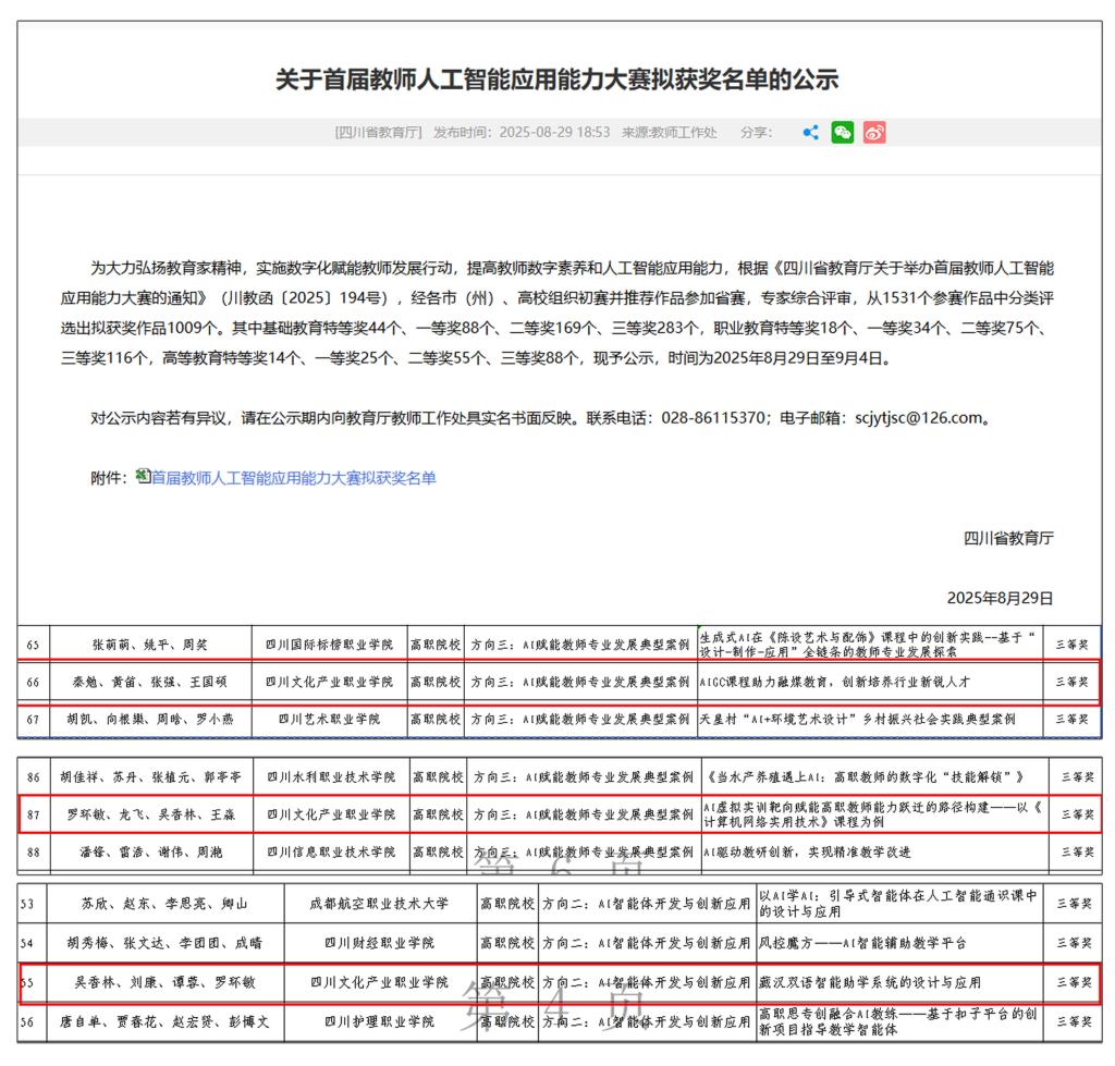 近日,四川省教育厅公布了首届教师人工智能应用能力大赛的获奖名单。我校在此次大赛中,共获得三等奖3项,充分展现了我校在人工智能教育应用领域的实践与创新实力。